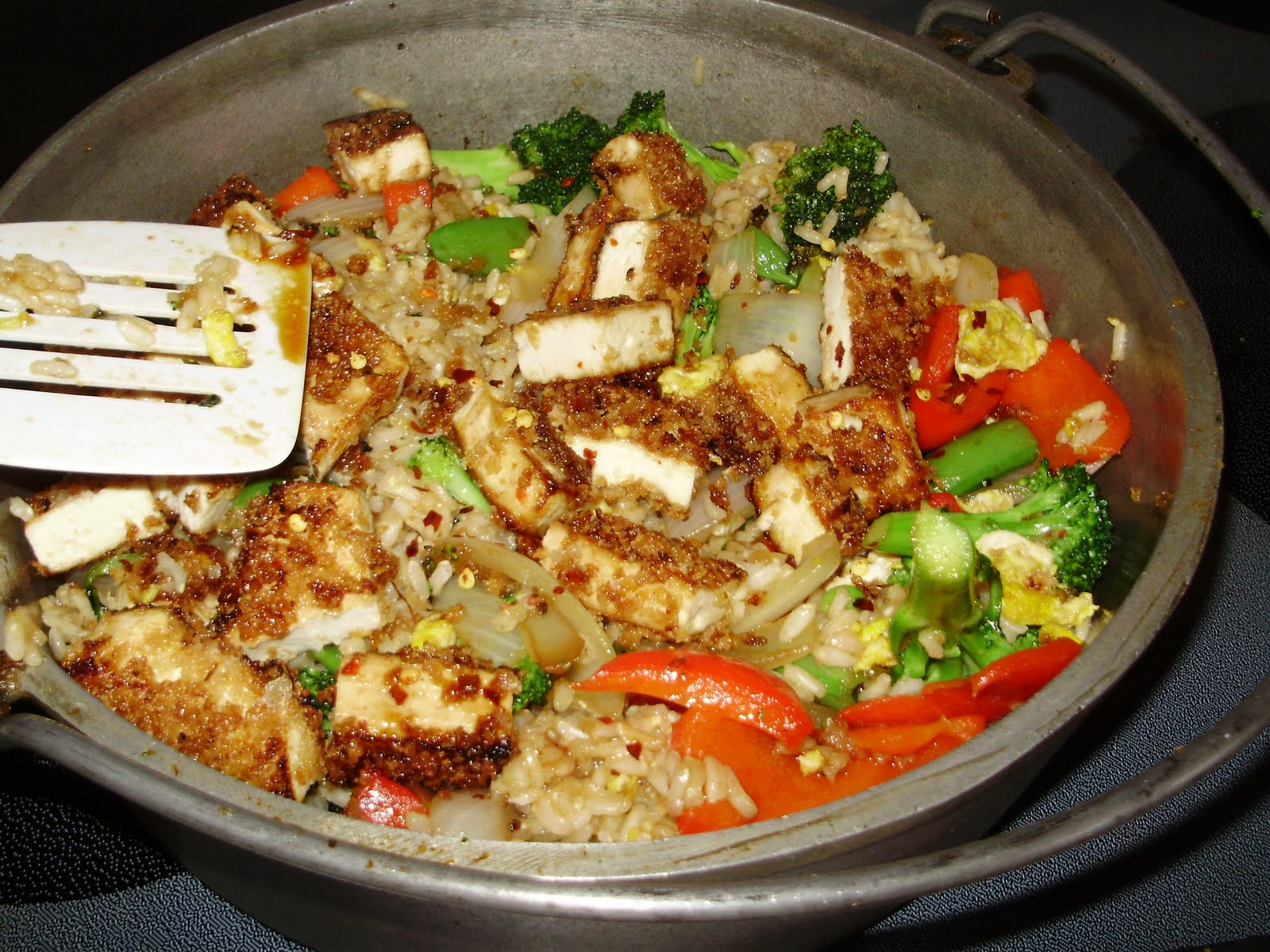 | Take out the tofu, add a little more oil, and stir fry whatever veggies you want. I used about 1 cup broccoli, 1 cup onion, 1/2 cup - 1 cup red bell pepper, and about 1/2 cup sugar snap peas. Add in 2 tsp grated fresh ginger and about 1 tbsp teriyaki marinade. Cook quickly over medium-medium high heat for about 6 minutes. Remove the veggies and throw in 1 cracked egg. Stir quickly, pan-scrambling. After you remove the egg, add a little more oil to the pan and then add leftover, or refrigerated rice. (Same amount you'd normally make - 1 cup dry). Continually stir the rice for a few minutes. Add in 1 tbsp teriyaki marinade. Take the rice off the heat and add the veggies and egg back in. Mix everything together. Top with the tofu and then drizzle with about 2 tbsp low-sodium soy sauce and 1 tsp red pepper flakes. |